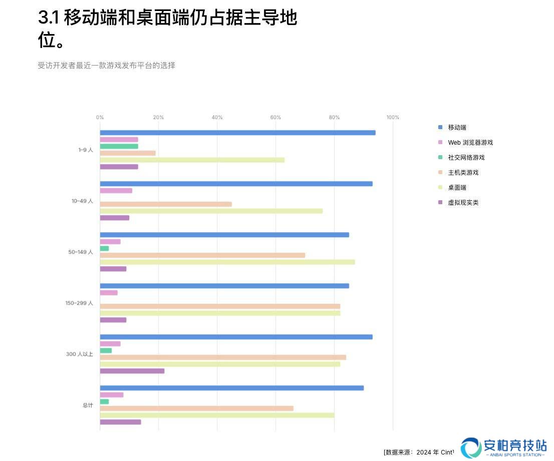 在发布平台方面,90%的受访者表示会选择移动端,这一比例在不同规模的工作室中保持稳定。然而,在游戏机平台发布方面存在显著差异:小型工作室(少于10人)中仅有19%选择该平台,而在大型工作室(超过300人)中,这一比例高达84%。