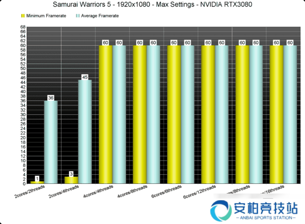 为了测试本作在CPU多线程上的利用程度,外媒分别模拟出了一个双核,四核和六核心CPU,测试发现《战国无双5》在双核CPU上运行时会出现严重的卡顿情况,在启用超线程后卡顿情况依旧存在,因此DSOG建议至少在四核CPU上进行游戏。