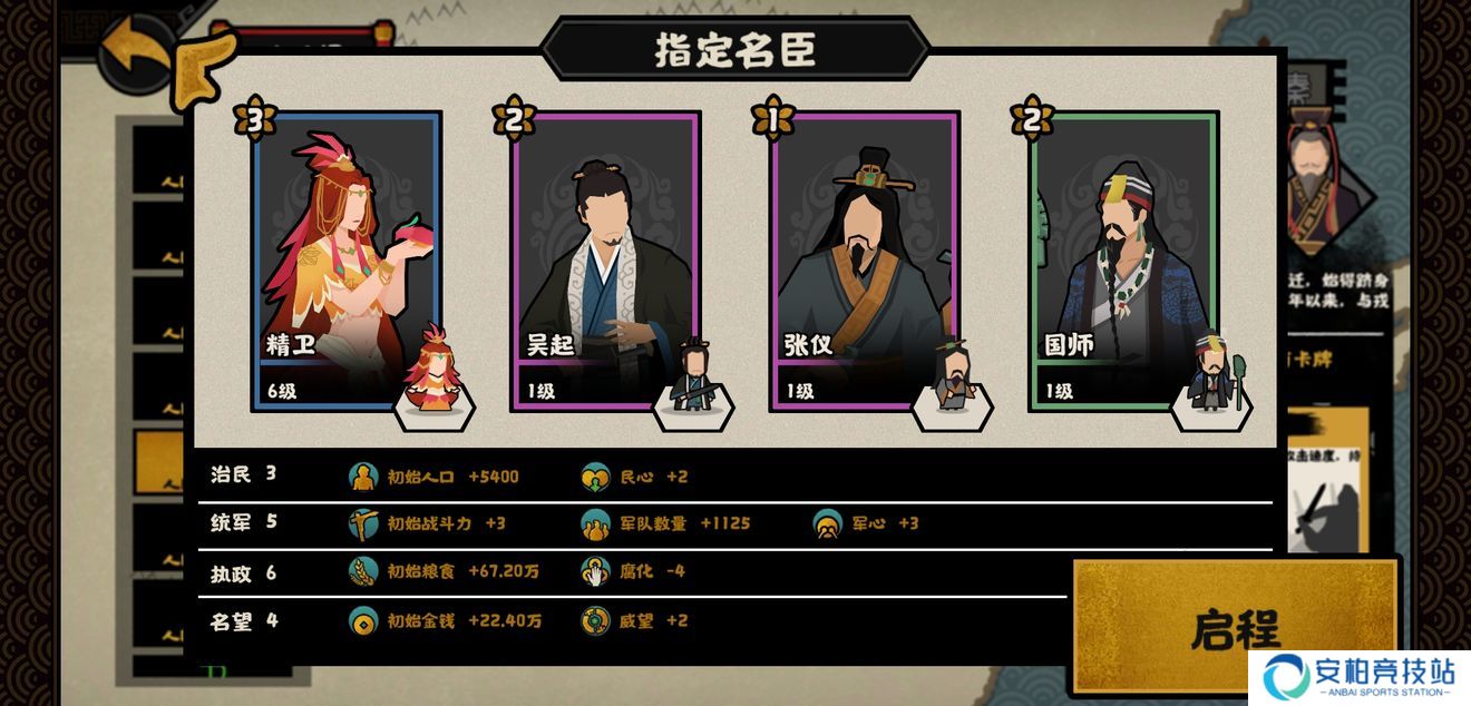 这套阵容非常的霸道,增加发展时间,并且可以提供持续的军心,民心,威望,降低腐化,最夸张的是他们都可以互补,且不需要大量特殊资源,民心可以靠姜子牙互补商鞅的腐化降民心,军心威望白起,商鞅,看似都是基础数据平平无奇,实则有多强劲只有玩了才知道,如果你有以上名臣可以无脑上,缺点太难集齐了,而且对等级有要求。