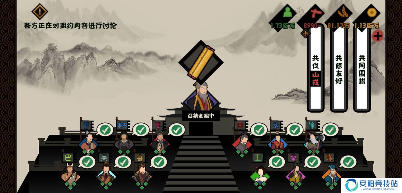 观兵:双方可各获得10%战斗力加成持续两年,这一点还是很可观的,毕竟观兵只消耗很少的钱共伐:邀请盟友一起进攻他国、这个玩法就很大了,如果我们前期就遇到超级AI或者很强劲的国家不好啃的硬骨头,我们除了可以通过会盟制定盟约共伐,也可以通过多结交几个盟友一起合纵,即使不灭国也要元气大伤。
