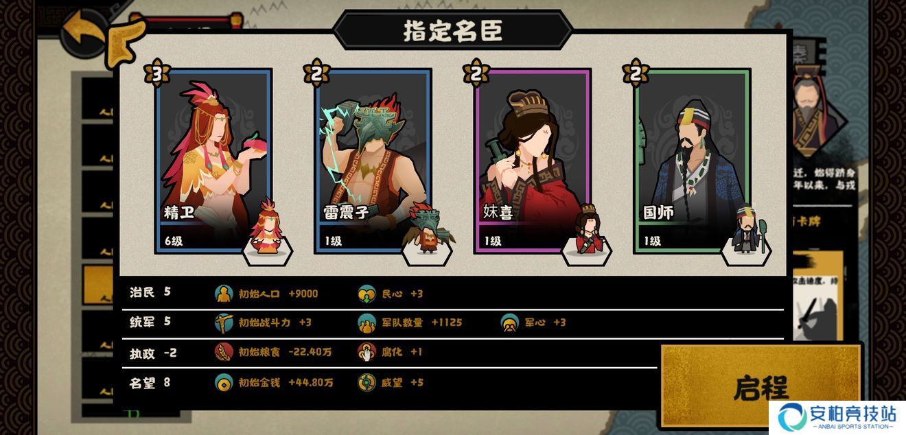 这套阵容比较偏于特殊玩法,利用妹喜的全员腐化,当然也包括自己,让敌国自治。即使不自治,配上雷震子的雷暴卡牌,进攻高腐化的国家,基本上可以做到碾压平推,配上精卫的循环战斗力以及投石,战斗体验会非常舒服。推荐没有高品质名臣,又想玩速推的玩家使用,不过一定要把握尺寸、腐化可是个双刃剑,可不要陷入叛乱以及入不敷出的泥潭哦。