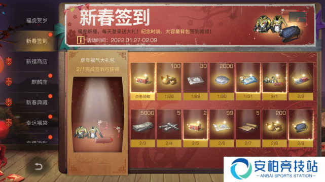 福虎幸运礼盒:其中1月27日成功签到可获得福虎幸运礼盒*1、2月5日成功签到、可获得福虎幸运礼盒*2。