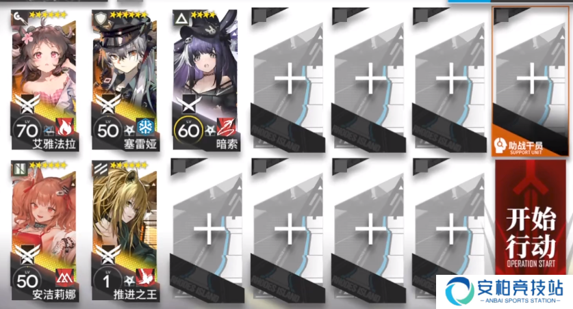 干员选择带上推王,安洁莉娜,塞雷娅,艾雅法拉和暗索。推王可换任意挡2干员,暗索可换任意拉人干员。