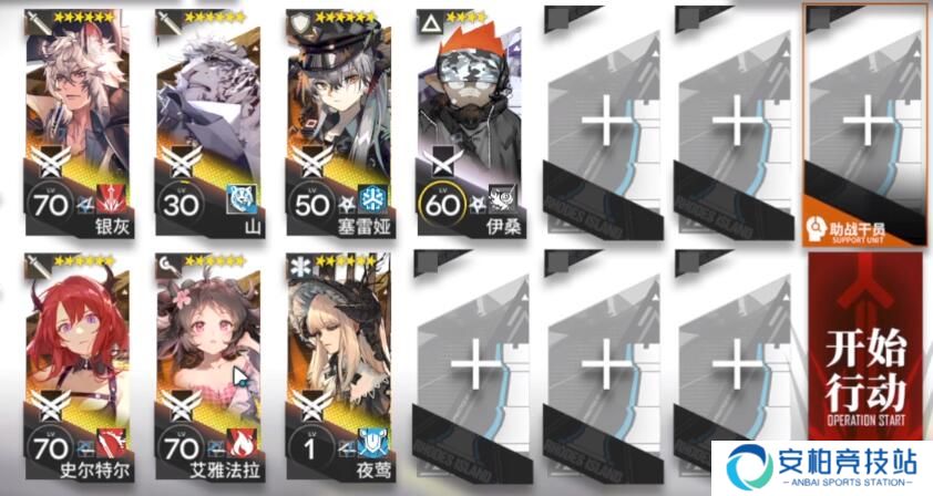 干员带上银灰、史尔特尔、山、艾雅法拉、塞雷娅、夜莺和伊桑。这里山起到一个自回血站点的作用,如果没有山的话可以替换成二技能银灰,同时把银灰替换成任意地面输出干员。